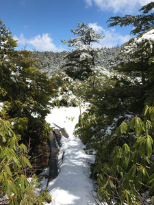 比較的すぐ湖に歩いて行けるという有料駐車場を通り過ぎ、やや離れた無料の駐車場に停めて、シラビソ、トウヒ、ツガなどの原生林の中を歩いて行くことに。ひんやりした空気の中雪残る道をザクザク歩を進める。40分ほどかけて歩くうち、雲は大きく流れ原生林とのコントラストに目を見張る。